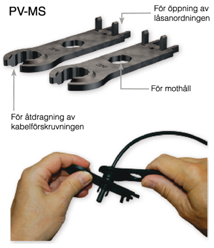 Bestående av två montagenycklar för montage och demontage av kabelförskruvningen och för öppning av låsanordningen.